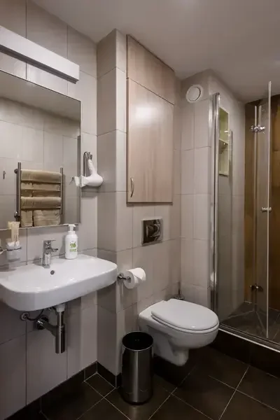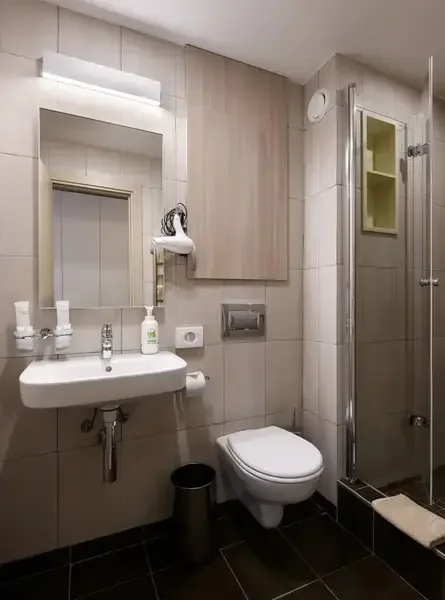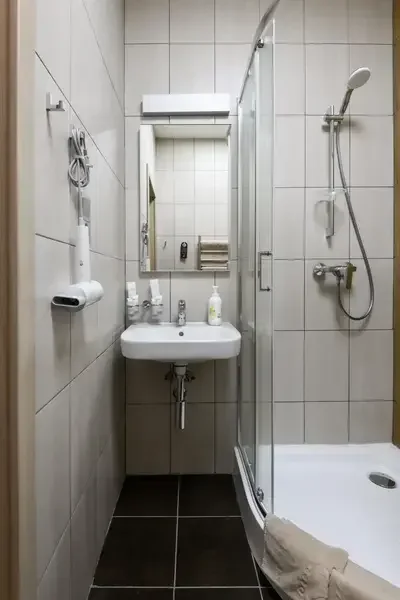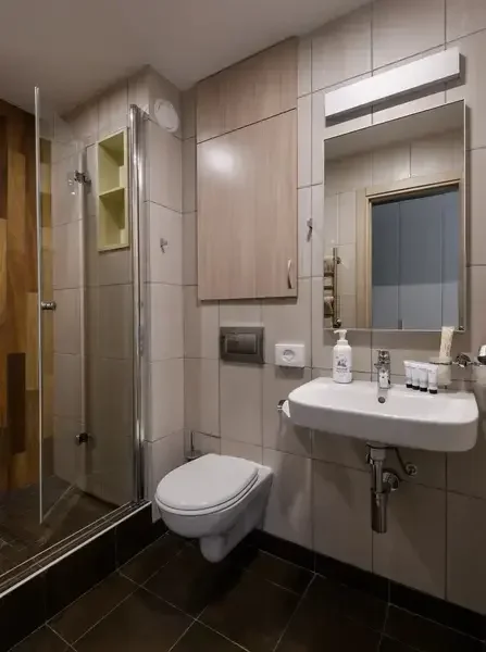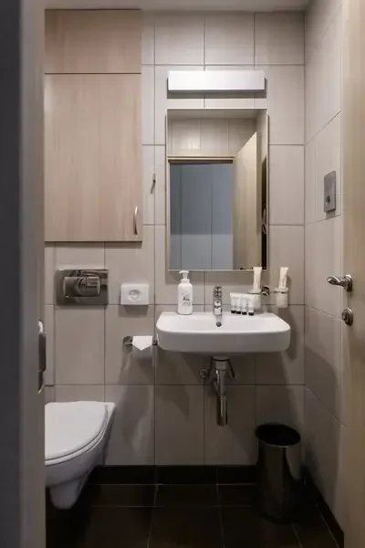 В номере есть все для проживания: односпальная кровать, прикроватная тумбочка, шкаф для одежды, туалетная комната, душ, фен, зеркало и др.