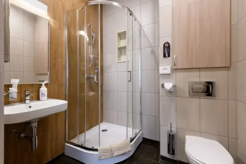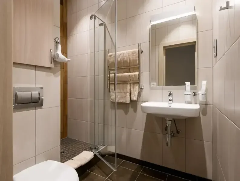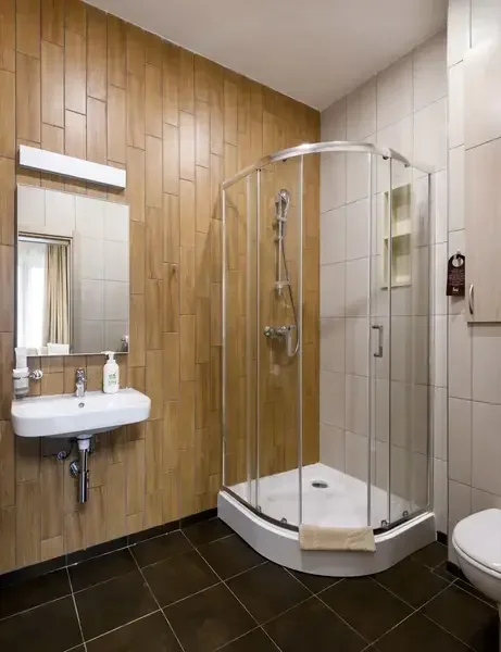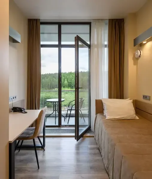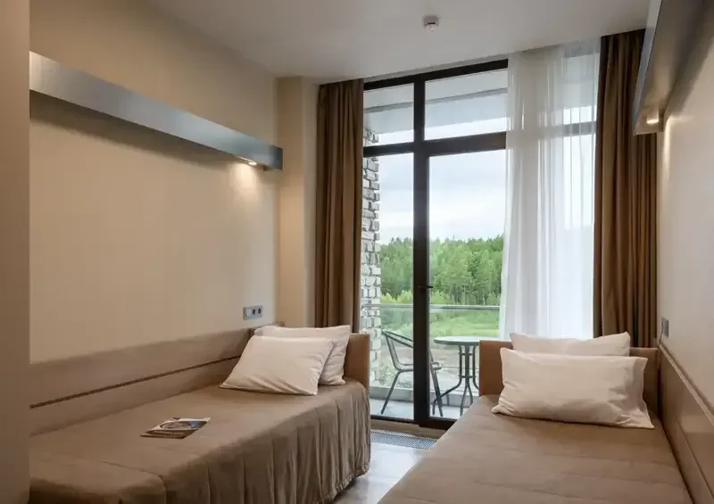 Вы можете выбрать номер на солнечной или северной стороне. Вид из окна на лиственный лес или пруд. Отделка выполнена из светлых приятных оттенков для лучшего отдыха наших гостей. В номере для вашего удобства: две односпальные или одна двухспальная кровать с прикроватными тумбочками, шкаф для одежды, тумба. Туалетная комната и душ. Кроме того, чайник, кружки, фен и телевизор в каждом номере.