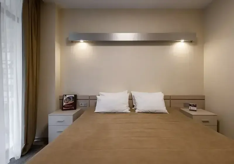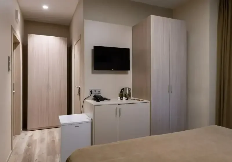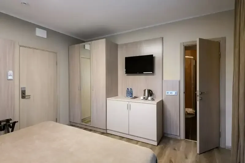 Отделка выполнена из светлых приятных оттенков для лучшего отдыха наших гостей. В номере для вашего удобства: две односпальные кровати или одна двуспальная с прикроватными тумбочками, шкаф для одежды, тумба. Туалетная комната и душ. Кроме того, чайник, кружки, фен и телевизор в каждом номере.