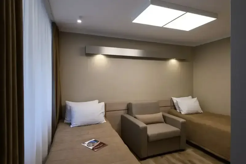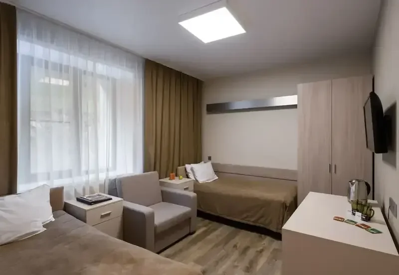 Вид из окна порадует своей красотой: лес, дорожки, ведущие к поликлинике и кафе. В двух шагах лесной массив. В номере есть все для комфортного пребывания всей семьи: большой шкаф для одежды, три односпальные кровати с прикроватными тумбочками, письменный стол и мягкий стул, кресло. Кровати можно сдвинуть, предоставляется топеры – матрас для сглаживания швов. В номере махровые халаты и тапочки, 2 кружки с блюдцами, чайник, фен. Душевая кабина и туалетная комната.