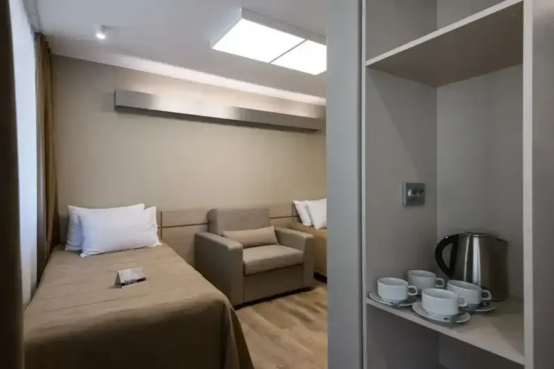 В номере есть все для комфортного пребывания всей семьи: большой шкаф для одежды, три односпальные кровати с прикроватными тумбочками, мягкий стул, кресло. Кровати можно сдвинуть, предоставляется топеры – матрас для сглаживания швов. В номере махровые халаты и тапочки, 2 кружки с блюдцами, чайник, фен. Душевая кабина и туалетная комната.