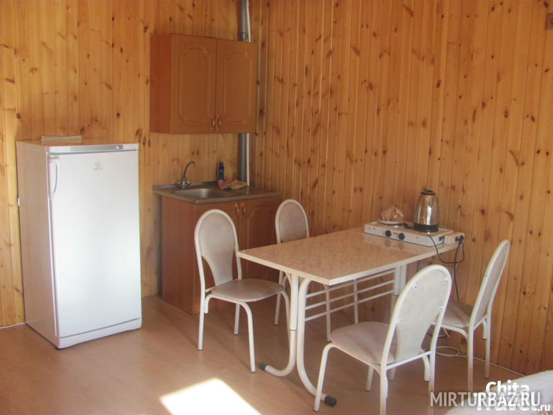 В номере комфортная удобная мебель, плита, холодильник, чайник, кухонный стол, стулья.