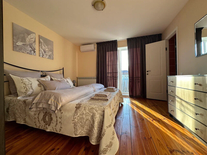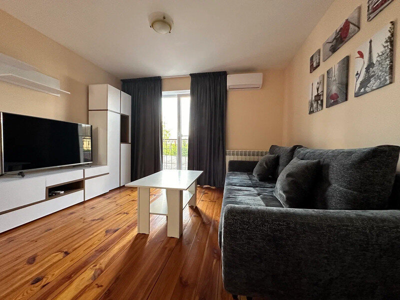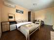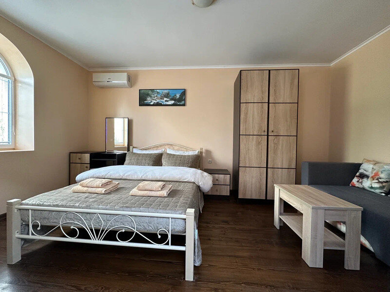 Кровать двуспальная, диван, тумбы, шкаф, телевизор, кондиционер, холодильник, туалет и душевая, набор полотенец, постельное белье. Кухня общая.